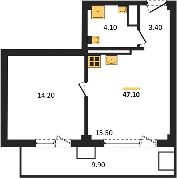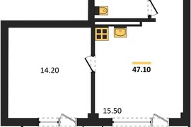 Общей площадью 47,1 кв.м., кухня 15,5 кв.м., жилая площадь 30 кв.м., санузел 4,1 кв.м., прихожая 3,4 кв.м., лоджия 9,9 кв.м., высота потолка 3,3 м.