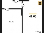 Общая площадь 42 кв.м., жилая площадь 12 кв.м., комната 12 кв.м., кухня 18 ув.м., прихожая 7 кв.м., санузел 4 кв.м., лоджия 4 кв.м.